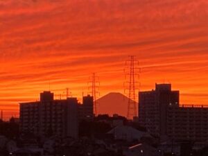 坂の上に着いた時にふと見てみると、ビルとビルの間から真っ赤な富士山が見えるではありませんか!
