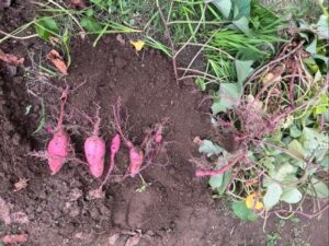 Richさんのお家では、うっかり芽が出てしまったサツマイモをお庭に植えてみたところ、大小合わせて5つのサツマイモが収穫できたとのこと。