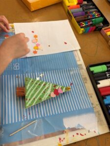 井土ヶ谷小学校放課後キッズクラブで開催した冬の工作教室は、建築廃材を材料にした『SDGsなクリスマスツリーペイント』