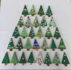 ツリーの側面を虹色にしたり、ライトや雪を表現したり、青や白いツリーがあったりと、個性的なツリーが完成していました。