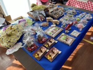 入り口を入って直ぐの広いフロアをお借りして、それぞれの作家さんがテーブルの上に自作の品物を広げ(フェルト作品に小物や編み物、布製品、木で作った作品等など)、そこにご入居の方々をお出迎え。